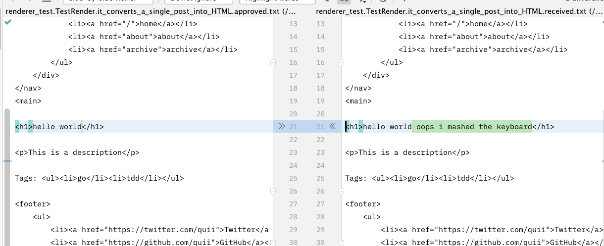 Now we're happy with our package's API design and got some basic behaviour driven out with TDD, let's change our test to use approvals.